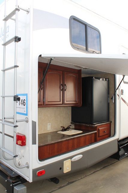 an Outside Shower, Speakers and Kitchen with bathroom access door. All the comforts needed for a great family get away. Spend quailty time together by going CAMPing!