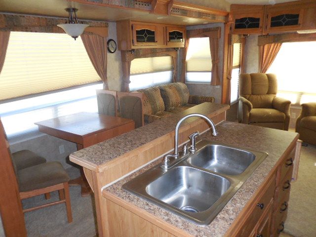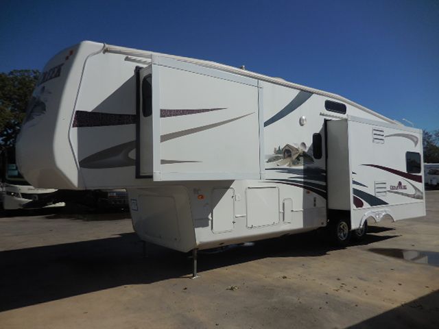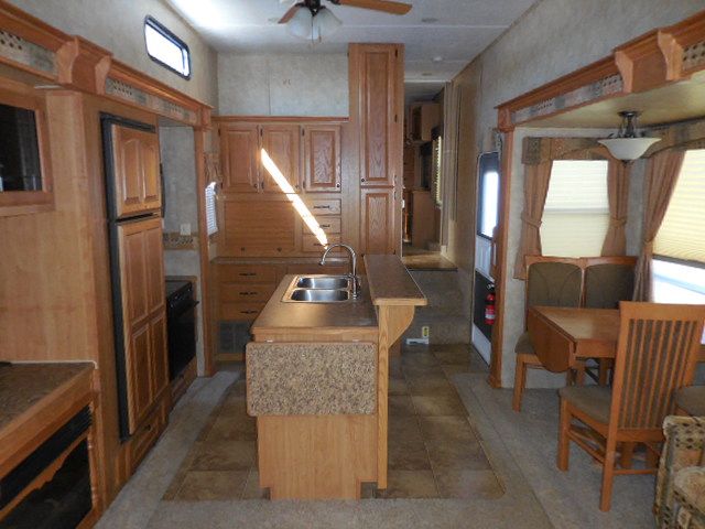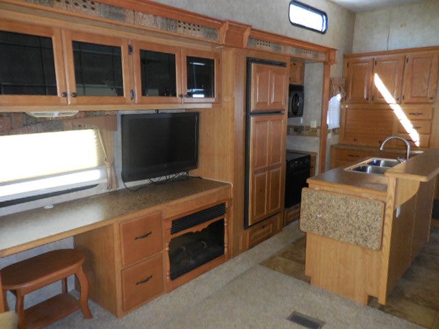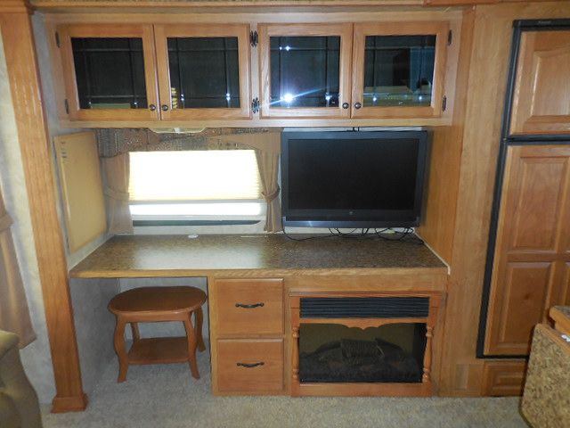 This 2008 Forest River has an Electric Landing Gear. Additional features include....3 Slide-outs, 1-Ducted Roof A/C, 2-Door Refrigerator, Satellite Dish, TV, DVD Player, Outside Shower, 3 Burner Range, Oven. Ceiling Fan, Fireplace and Electric Awning. Get ready to hit the road! Family friendly 5th wheel, great for last minute trips!