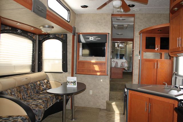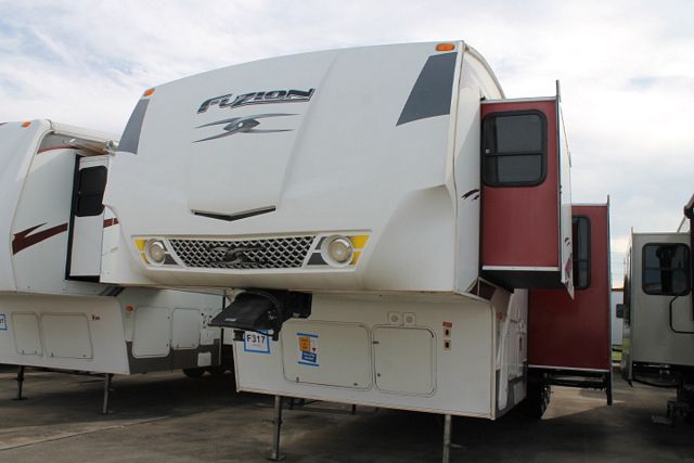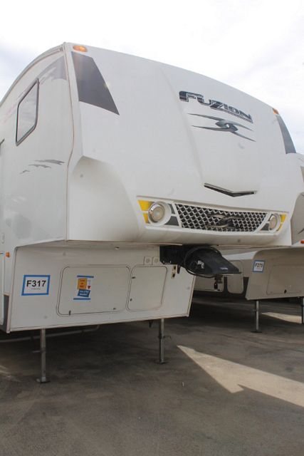 This 2008 Fuzion Toyhauler By Keystone is ready to hit the dirt. Comforts include....Electric Landing Gear, 2 Slide-outs, Onan Gas Generator, 2 Ducted Roof A/Cs, Double Door Refrigerator, Main Awning, Washer/Dryer Connections, CD Radio, Outside Speakers, TV, DVD Player, Outside Shower, Microwave, 3 Burner Range and Oven. Gather family and friends, Load the toys and hit the road to your favorite spot. Get Out and Go CAMPing Now!