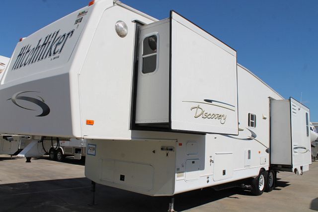 This 2001 Hitchhiker By Nu-Wa has a nice bedroom/bathroom layout with plenty of privacy. Options include....Electric Landing Gear, 3 Slide-outs, 1 Roof A/C, Double Door Refrigerator, Main Awning, CD Radio, DVD Player, Outside Shower, Microwave, 3 Burner Range and Oven. Your sure to enjoy your stay at the campground with all the comforts of this Hitchhiker.