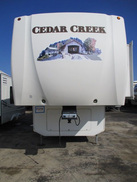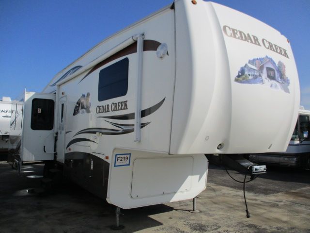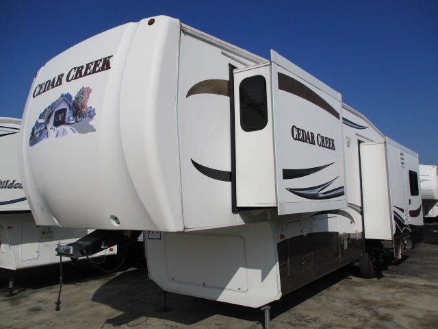 This 2011 Cedar Creek By Forest River has an Electric Landing Gear, 3 Slide-outs, 2 Ducted Roof A/Cs, Double Door Refrigerator, Main Awning, Washer/Dryer Connections, 2 TVs, DVD Player, Outside Shower, Microwave, 3 Burner Range, Oven. Great fifth wheel for full timers. Let's go RVing!