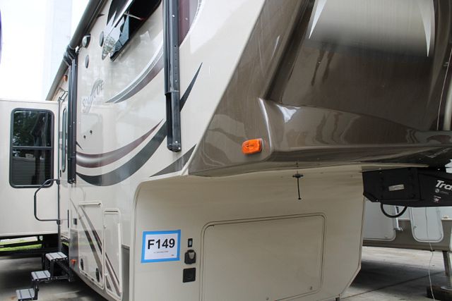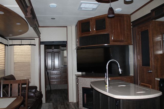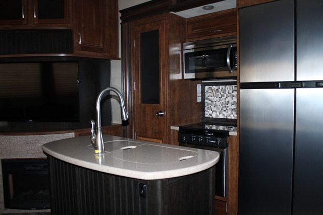 This Nearly Near 2016 Solitude By Design is loaded with great features that include ....Automatic 6 Point Hydraulic/Electric Landing Gear, 5 Slide-outs, Onan Propane Generator, 2 Ducted Roof A/Cs, 4 Door Refrigerator, Main Awning,Fireplace, 1 Piece Washer/Dryer, CD Radio, Heated Tanks, Outside Speakers, 3 TVs, 3 DVD Players, Outside Shower, Convection Microwave, 3 Burner Range and Oven. Also has an Outdoor Kitchen for great family cooking. Stop by and see This Solitude TODAY!