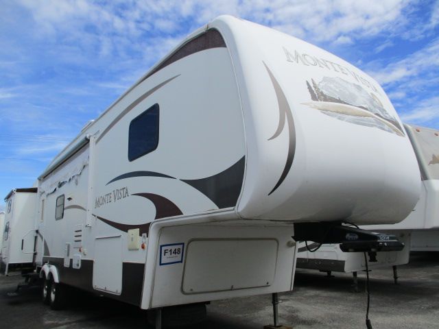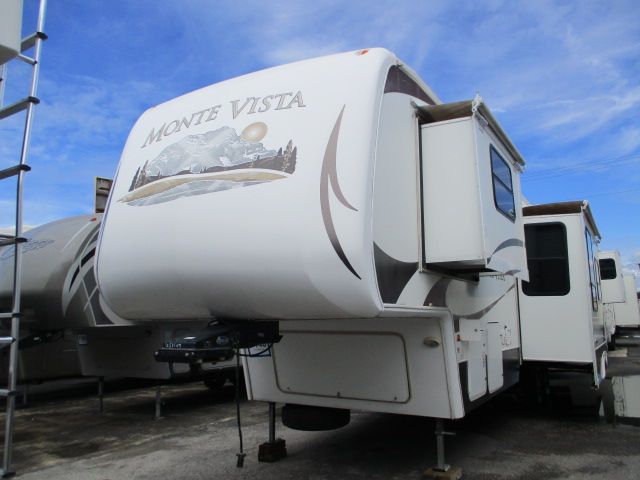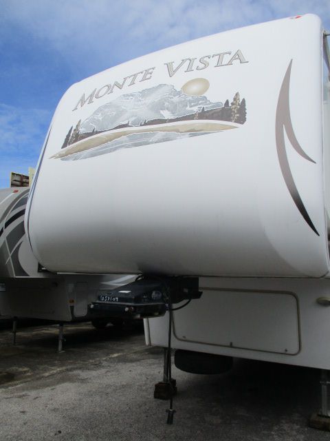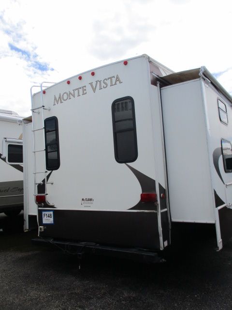 This 2008 Monte Vista has an Electric Landing Gear, 4 Slide-outs, 2 Ducted Roof A/Cs, Double Door Refrigerator, Main & Slide Awnings, Washer/Dryer Connections, Outside Speakers, Outside Shower, Microwave, 3 Burner Range, Oven. Wonderful bunkhouse floorplan. Let's go RVing!