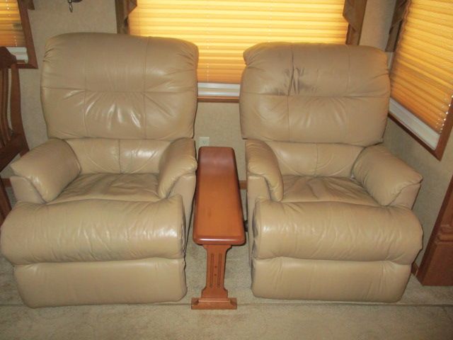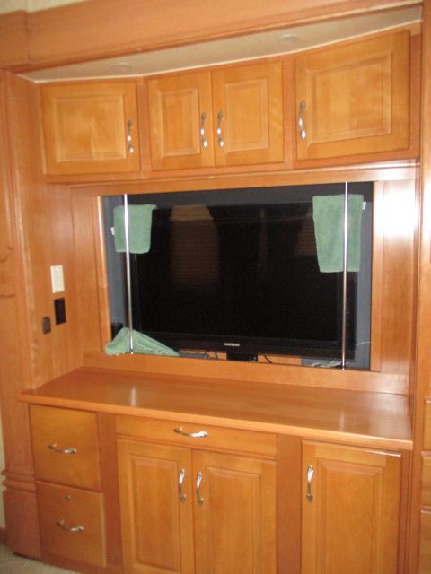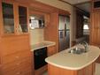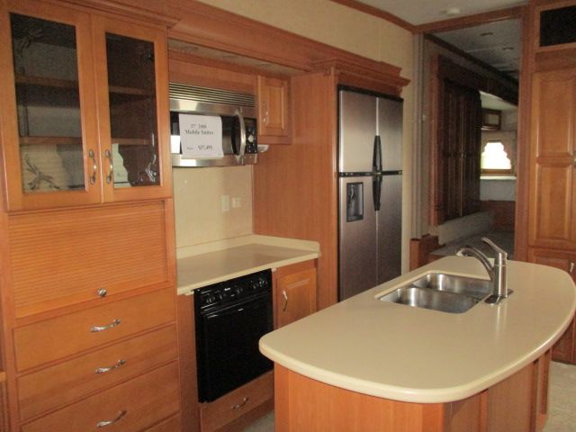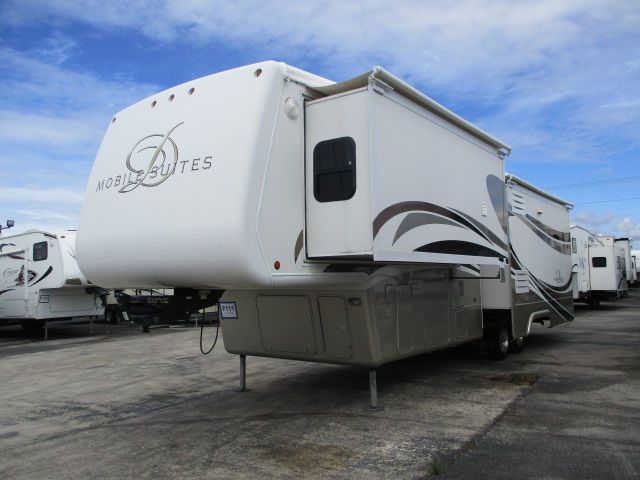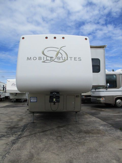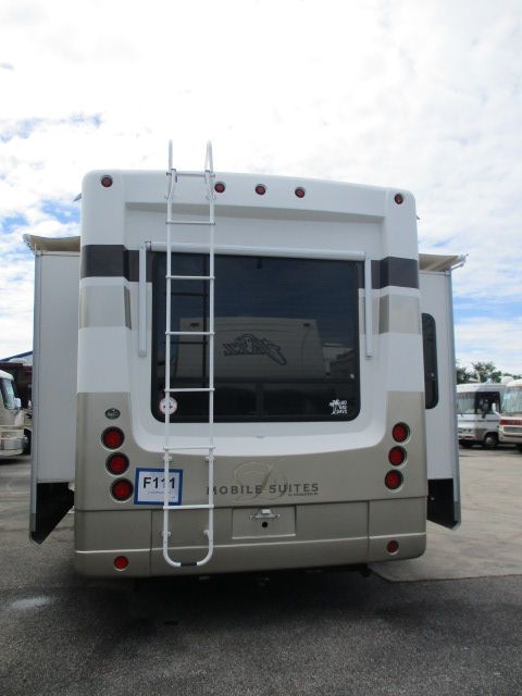 This 2008 Mobile Suites has an Electric Landing Gear, 3 Slide-outs, 2 Ducted Roof A/Cs, 4 Door G/E Refrigerator, Main & Slide Awnings, Washer/Dryer, Satellite Dish, TV, Outside Shower, Convection Microwave, 3 Burner Range, Oven