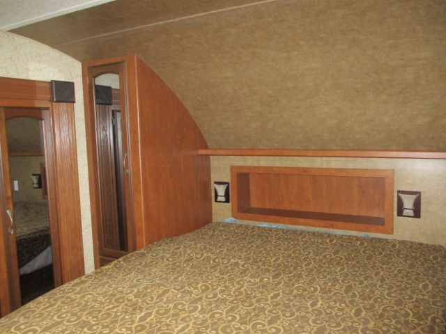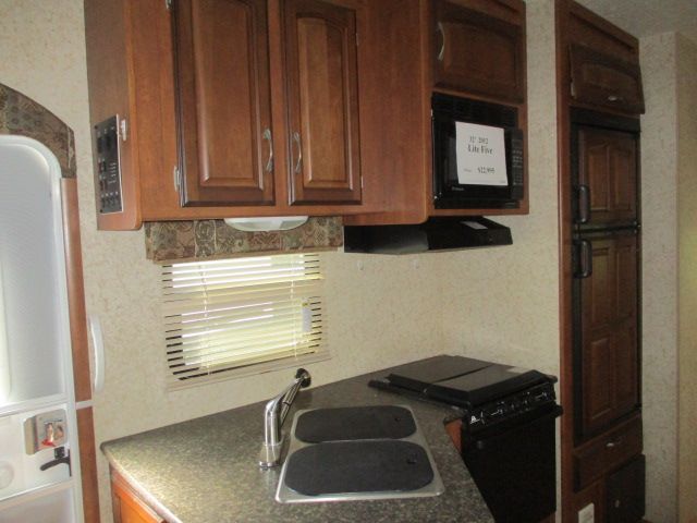 This 2012 Lite Five has an Electric Landing Gear, 2 Slide-outs, 1 Ducted Roof A/C, 2 G/E Refrigerator, Main Awning, CD Radio, Outside Speakers, 2 TVs, DVD Player, Outdoor Kitchen, Outside Shower, Microwave, 3 Burner Range, Oven