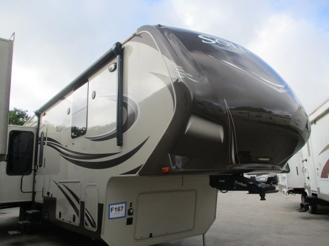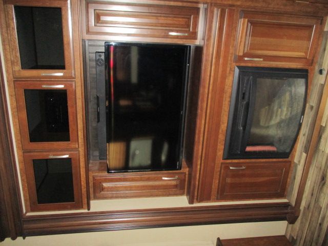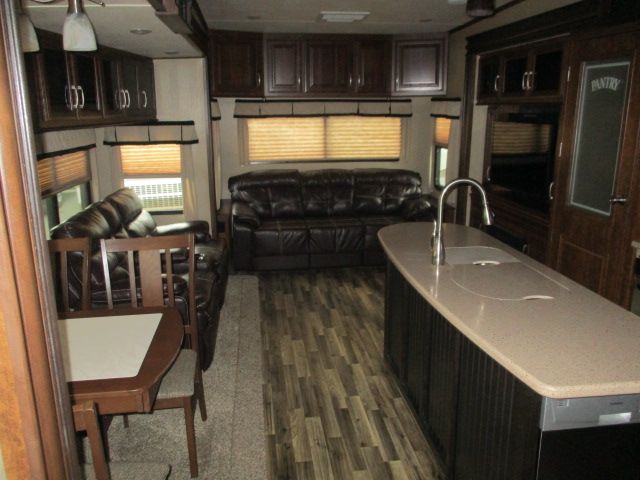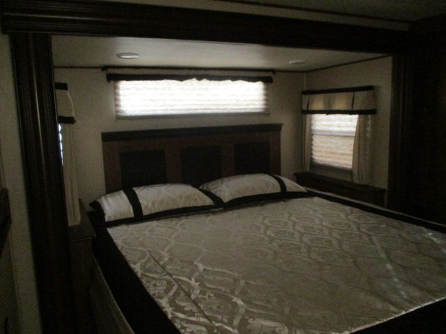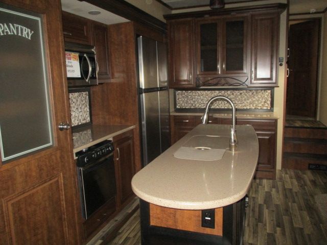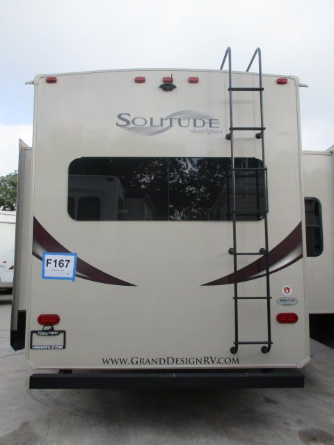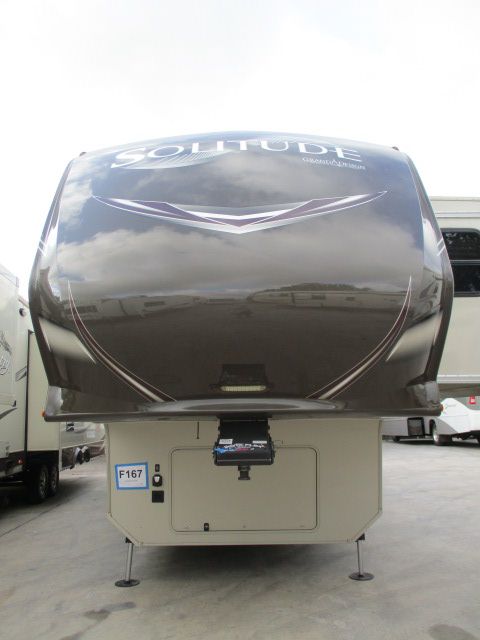 This 2016 Solitude has an Electric Landing Gear, 3 Slide-outs, 4 G/E Refrigerator, Main Awning, Washer/Dryer Connections, CD Radio, Heated Tanks, Outside Speakers, 2 TVs, Outside Shower, Convection Microwave, Oven