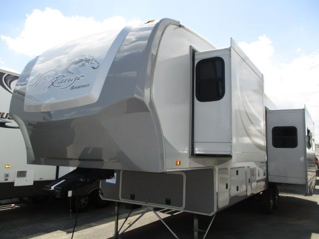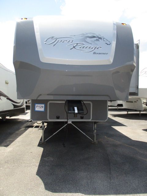 This 2014 Open Range Roamer has a 3 Slide-outs, 2 Ducted Roof A/Cs, Double Door G/E Refrigerator, Main Awning, Washer/Dryer Connections, CD Radio, Outside Speakers, 2 TVs, DVD Player, Outdoor Kitchen, Outside Shower, Microwave, 3 Burner Range, Oven