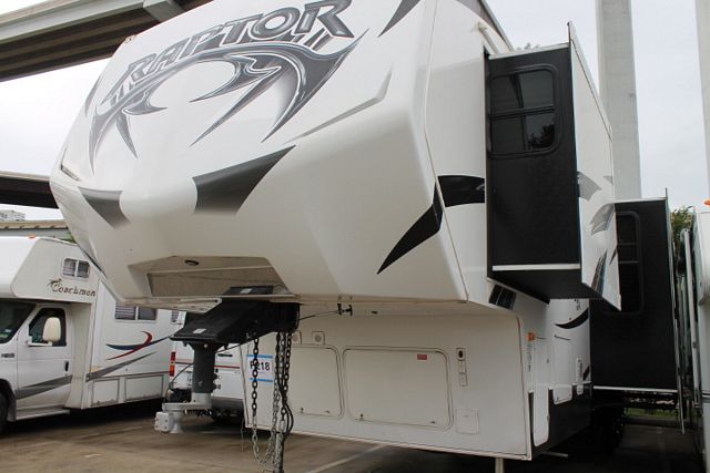 This Wonderful 2014 Raptor By Keystone is loaded with nice features include.... Electric Landing Gear, 3 Slide-outs, Onan Gas Generator, 3 Roof A/Cs, Double Door Refrigerator, Main Awning, Outside Speakers, CD Radio, DVD Player, 2 TVs, Microwave, 3 Burner Range and Oven. Loaded the toys for some great adventures in the outdoors. Go CAMPing!