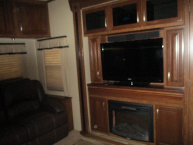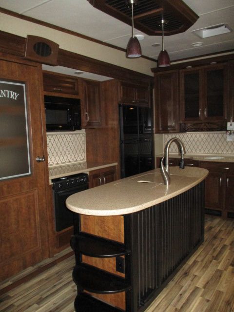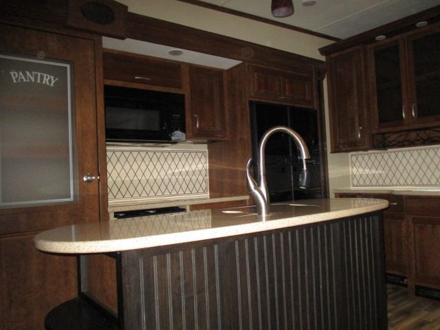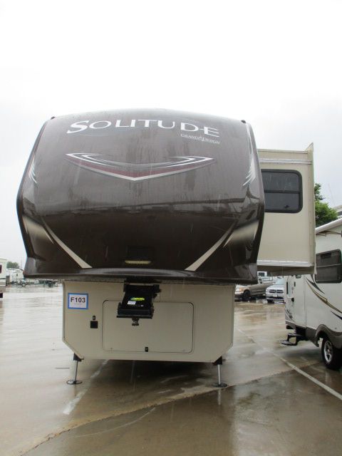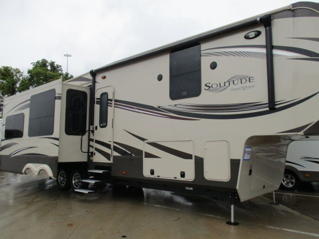 Large Kitchen Pantry This Nearly New 2014 Solitude By Grand Design has a wonderful full time living floor plan. Comforts include....Electric Landing Gear, 3 Slide-outs, 2 Roof A/Cs, Fourd Door Refrigerator, In-Fridge Ice Maker, Main Awning, Washer/Dryer Connections, CD Radio, Outside Speakers, 2 TVs, DVD Player, Outside Shower, Microwave, 3 Burner Range and Oven. Includes a Walk in Shower and King Size Bed for a great nights rest. Beautiful !