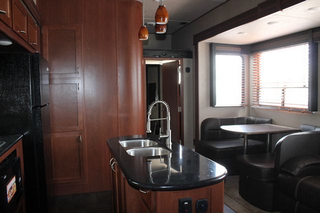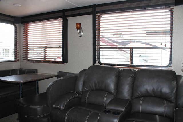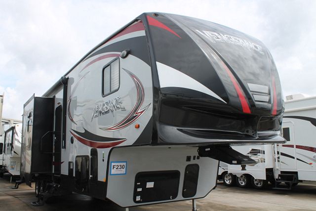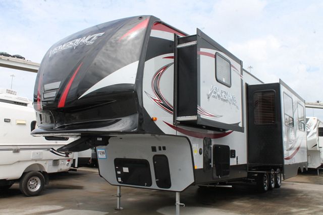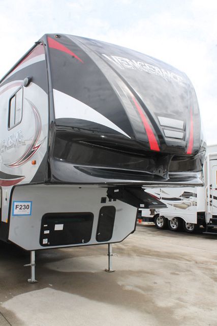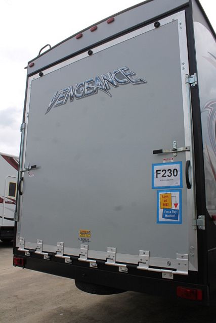 Toyhauler with 12' of Cargo Space and a Floating Patio. This Nearly New 2015 Vengeance By Forest River has bath and half floor plan with Queen Bunks in Cargo Area and a King Size Bed in the Front. It's Comforts include....Trail Air Suspension, Electric Landing Gear, 3 Slide-outs, Onan Gas Generator, 2 Ducted Roof A/Cs, Double Door Refrigerator, Main Awning, Washer/Dryer Connections, CD Radio, Outside Shower and Speakers, TV, Convection Microwave and 3 Burner Range. Take along your toys while traveling with all the comforts of home.