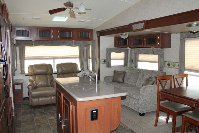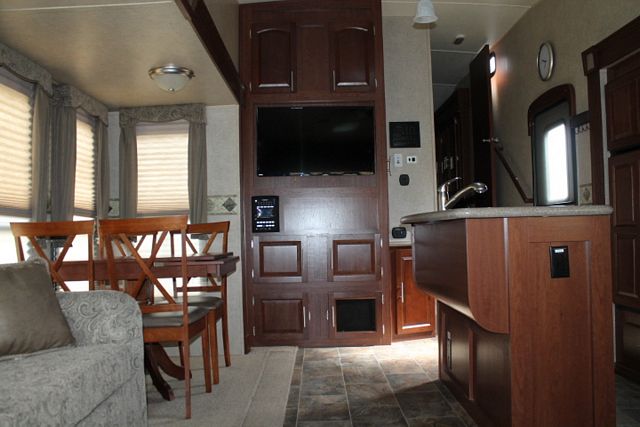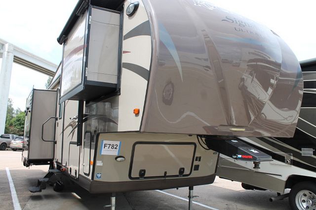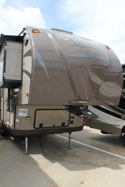 This Wonderful 2015 Rockwood Signature Ultra Lite with The Diamond Package has plenty of nice features including....Electric Landing Gear, 3 Slide-outs, 2 Ducted Roof A/Cs, Double Door Refrigerator, Main & Slide Awnings, Outside Shower and Speakers, DVD Player, Microwave, 3 Burner Range and Oven. This very popular island style kitchen is perfect with the added counter space and is great for the cooking enthusiast when away from home. This is a Sharp Looking 5th wheel with nice comforts throughout in entire Rig.
