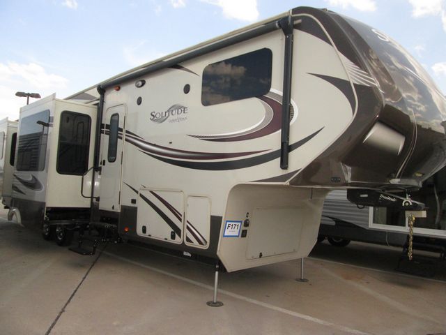 This Beautiful, Like New 2015 Solitude Has An Electric Landing Gear, Options Include... 5 Slide-Outs, 2 Ducted Roof A/Cs, Double Door Refrigerator, Main Awning, Washer/Dryer, CD Radio, Outside Stereo, 2 TVs, DVD Player, Outside Shower, Microwave, 3 Burner Range, And Oven. This Solitude Has All The Comforts Of Home, The Perfect Home Away From Home. Load Up The Family And Start Your Camping Adventures Now!!