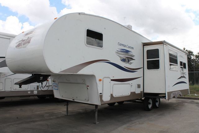 This 2007 Copper Canyon could be your next Camper. Options include....Electric Landing Gear, 1 Slide-out, 1 Roof A/C, Double Door Refrigerator, Main & Slide Awnings, CD Radio, Outside Speakers, TV, DVD Player, Microwave, 3 Burner Range and Oven. Hit the highway with the Copper Canyon in tow.