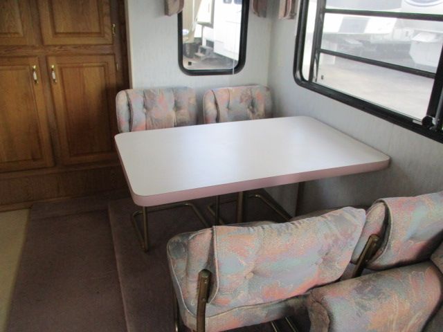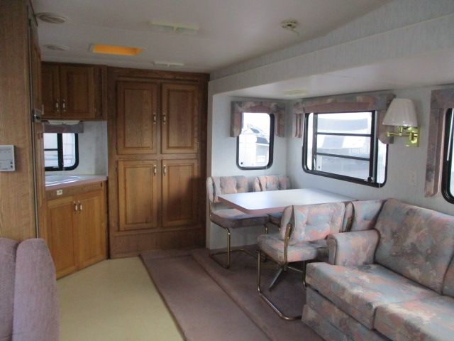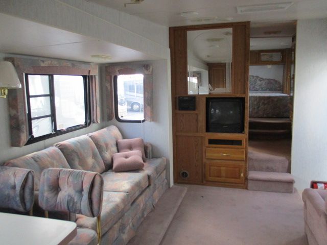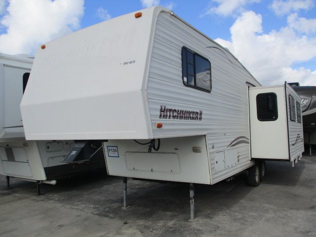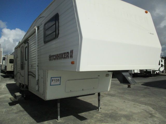 This 1997 Hitchiker II has an Electric Landing Gear, 1 Slide-out, 1 Ducted Roof A/C, Double Door Refrigerator, Main Awning, Cassette Radio, TV, Microwave, 3 Burner Range, Oven, Rear Kitchen.. Nice Older Unit With Plenty of Potential.