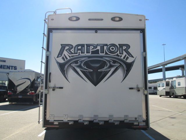This 2013 Raptor Toyhauler By Keystone is loaded with nice features that include.... Electric Landing Gear, 2 Slide-outs, Onan Gas Generator, 2 Roof A/Cs, Double Door Refrigerator, Main Awning, CD Radio, Outside Speakers, 2 TVs, DVD Player, Outside Shower, Microwave, 3 Burner Range and Oven. Also has a Fuel Station and Heated Tanks (Extreme Temperture).