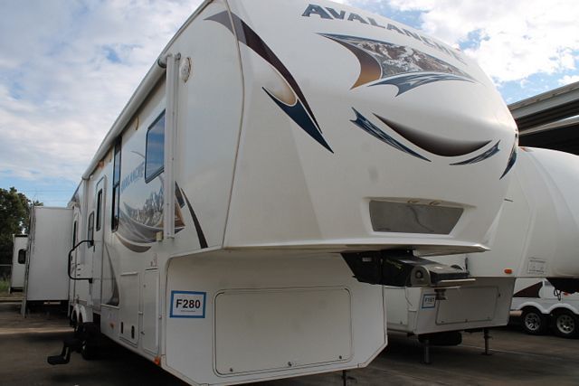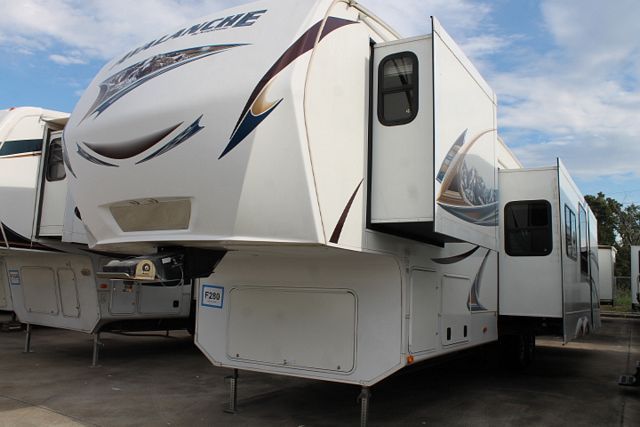 Bunkhouse Floor Plan! This 2013 Avalanche is perfect for the family on the go. It's Options include....Electric Landing Gear, 4 Slide-outs, 2 Ducted Air Conditioners, Double Door Gas/110V Refrigerator, Automatic Main Awning, Washer/Dryer Connections, CD Radio, Heated Tanks, Outside Shower and Speakers, 3 TVs, Microwave, 3 Burner Range and Oven. Bonus: Outdoor Kitchen for great family meals