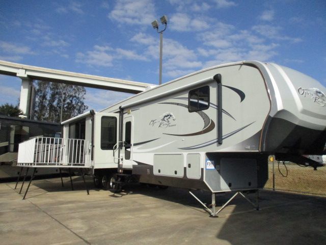 This 2012 Open Range Residential is loaded with great features that include.... Electric Landing Gear, 4 Slide-outs, 2 Ducted Air Conditioners, Double Door 110V Residential Refrigerator with Ice Maker, Automatic Main Awning And Slide Awning, Washer/Dryer Connections, CD Radio, 2 TVs, DVD Player, Outside Shower, Microwave, 3 Burner Range and Oven. Wonderfully designed Open Range with sliding glass doors and A relaxing porch.