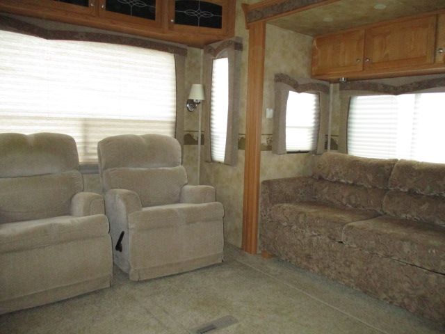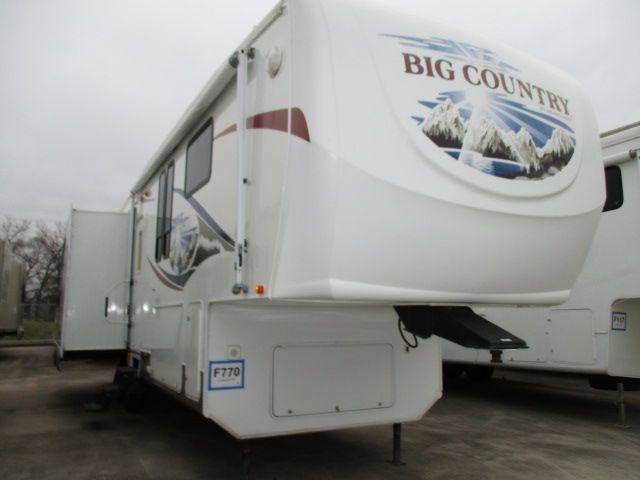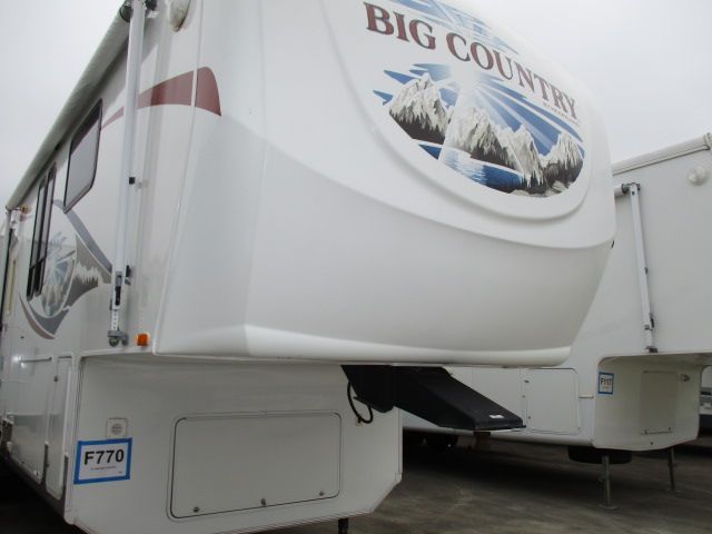 This 2008 Big Country has a Trailair Suspension for a smoother tow experience, Features include.... Electric Landing Gear, 3 Slide-outs, 1 Non-Ducted Air Conditioner, Michelin Tires, Double Door Gas/110V Refrigerator, Main Awning, Washer/Dryer Connections, Surround Sound, TV, Outside Shower, Microwave, 3 Burner Range and Oven. Also Includes a Queen Size Memory Foam Mattress and Plenty of Storage with Large Cargo Bays.