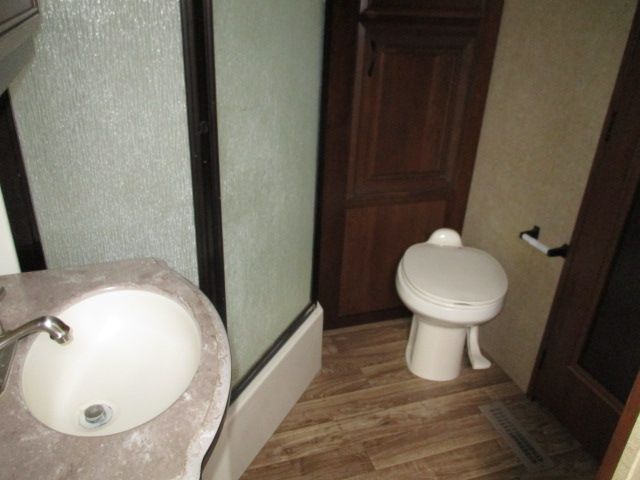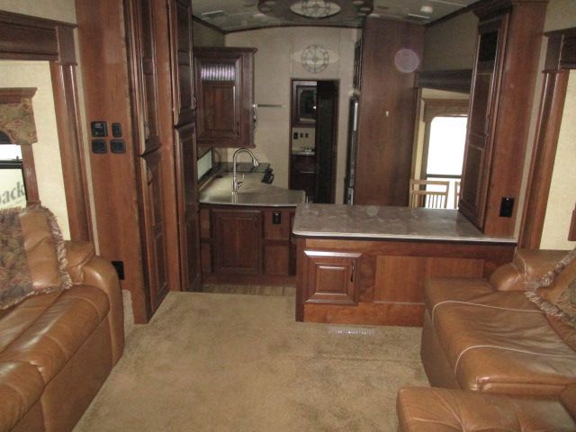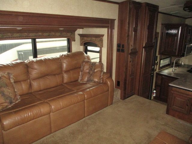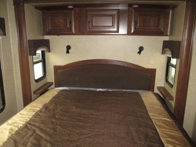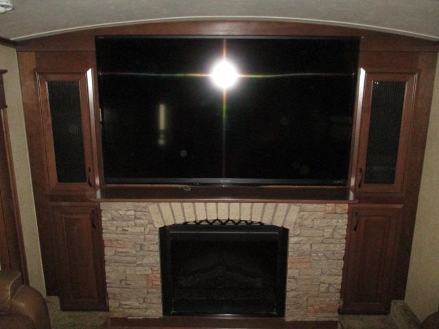 This 2015 Pinnacle has an Electric Landing Gear, 5 Slide-outs, 2 Ducted Air Conditioners, 110V Residential Refrigerator, In-Fridge Ice Maker, Automatic Main Awning And Slide Awning, Washer/Dryer, CD Radio, Outside Entertainment System, 3 TVs, 2 DVD Players, Outside Shower, Convection Microwave, 3 Burner Range, Oven
