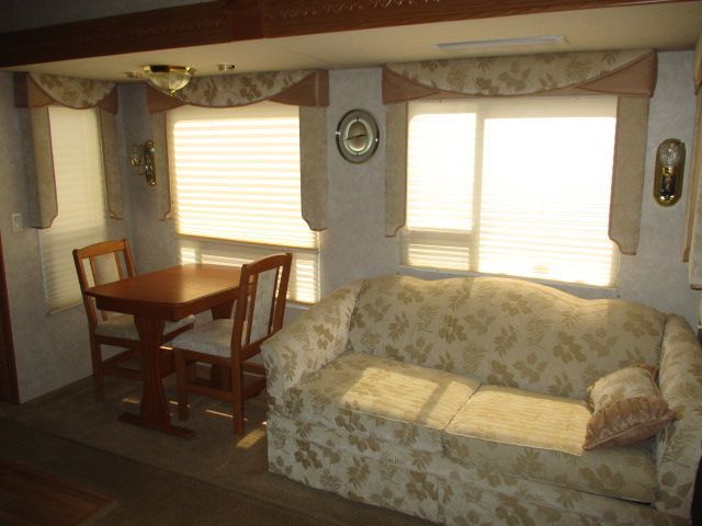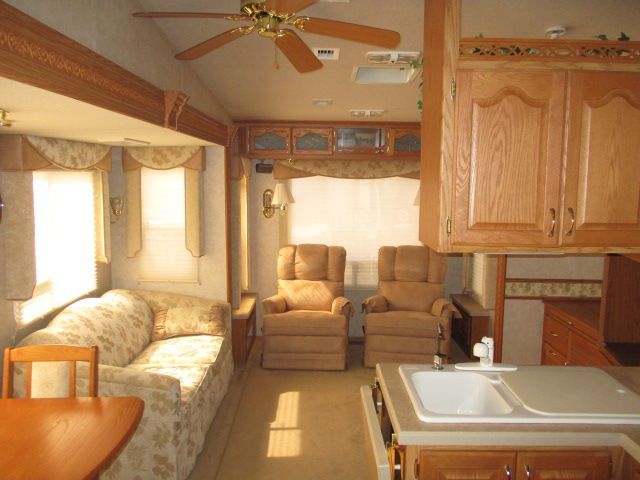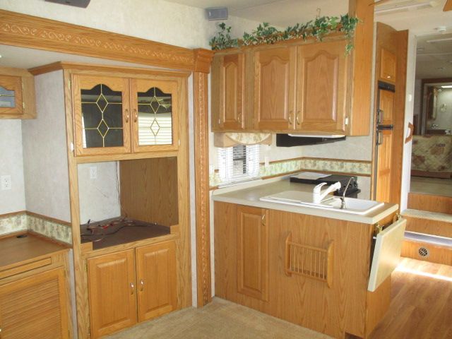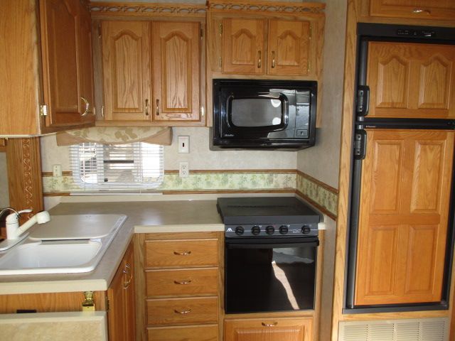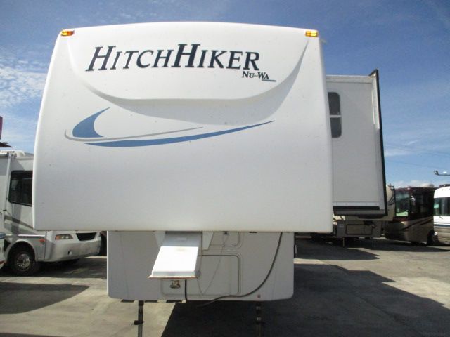 This 2005 Hitchhiker Discover America has an Electric Landing Gear, 3 Slide-outs, 1 Ducted Air Conditioner, Double Door Gas/110V Dometic Refrigerator, Main Awning, CD Radio, DVD Player, Microwave, 3 Burner Range, Oven