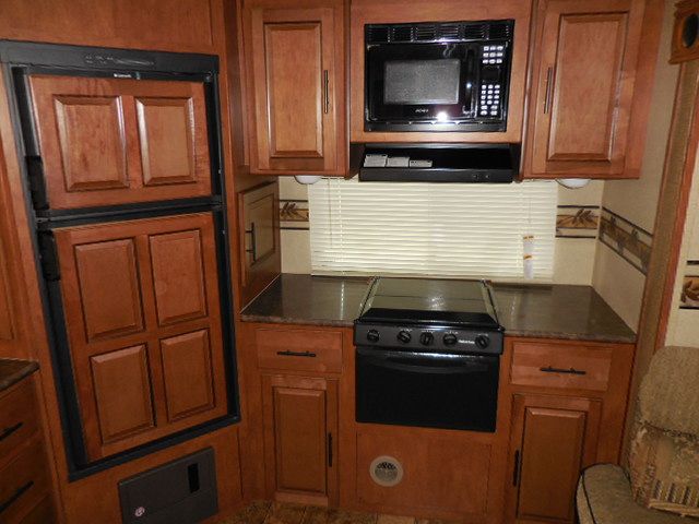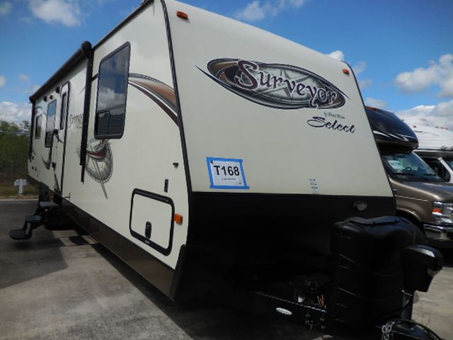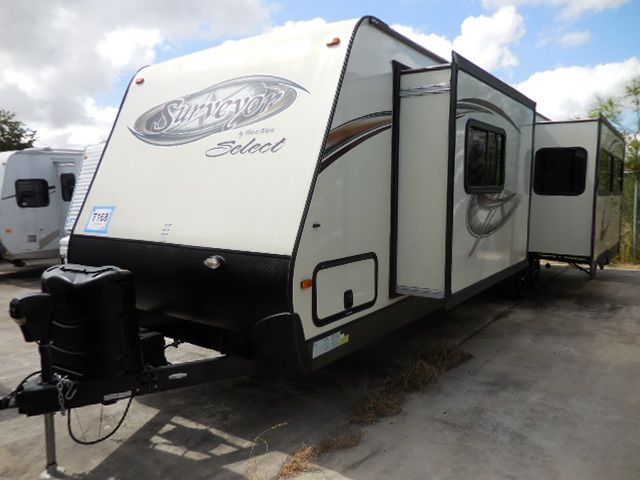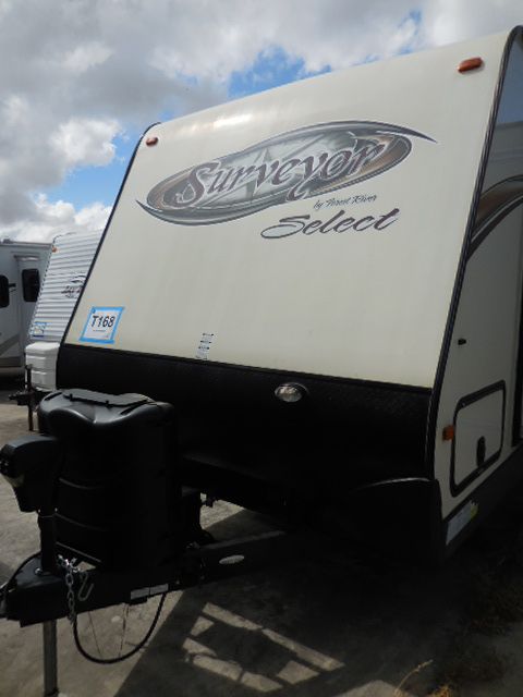This 2014 Surveyor By Forest River has an Electric Tongue Jack, 2 Slide-outs, 1 Ducted Roof A/C, 2 Dr G/E Refrigerator, Main Awning, CD Radio, TV, DVD Player, Outside Shower, Microwave, 3 Burner Range, Oven