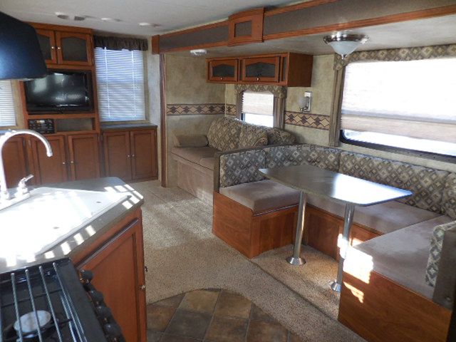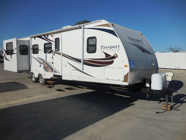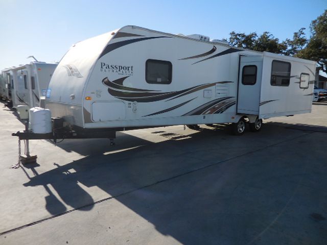This 2012 Passport Ultra has an Electric Tongue Jack, 2 Slide-outs, 1-Ducted Roof A/C, 2-Door Refrigerator, Main Awning, CD Radio, Outside Speakers, TV, DVD Player, Outside Shower, Microwave, 3 Burner Range, Oven, Outside BBQ Pit. Lets travel the USA! Great unit for those last minute weekend trips!