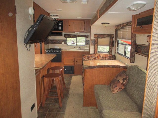 This 2013 Joey Series has an Electric Tongue Jack, 1 Slide-out, 1 Ducted Roof A/C, Double Door Refrigerator, Main Awning, CD Radio, Outside Speakers, TV, DVD Player, Outside Shower, Microwave, 3 Burner Range, Oven and bar with seats,. Great for tailgating or for getaways. Let's go RVing!