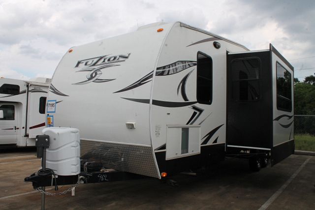 Wide Body, Toyhauler, Bunkhouse ! This Hardly Used 2013 Fuzion By Keystone has plenty of space to haul all of your toys with it's 10ft Cargo Area. Comforts include....2 Slide-outs, Onan Gas Generator, 2 Ducted Roof A/Cs, Double Door Refrigerator, Main Awning, CD Radio, Outside Shower and Speakers, 2 TVs, DVD Player, Microwave, 3 Burner Range, Oven. Includes Tuff Ply Flooring, Two Ram Air Vents in cargo hold and 30gal Fueling station. Load the toys, gather family and friends then hit the highway to great adventures
