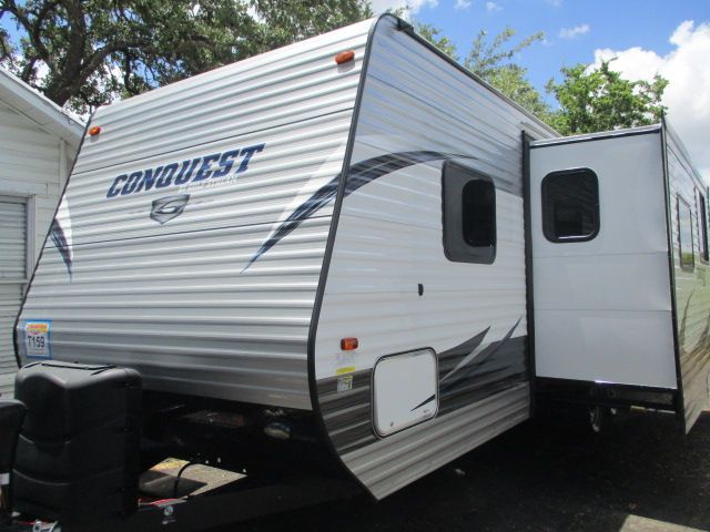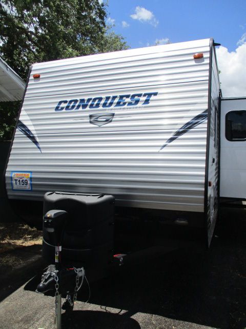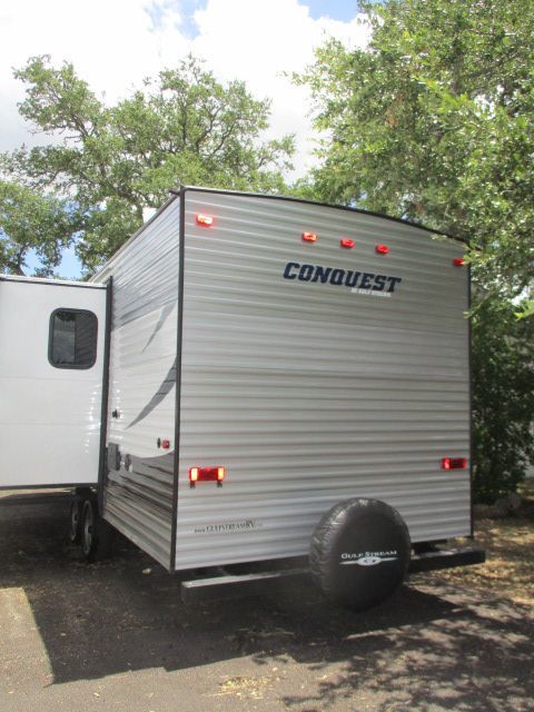 This 2017 Gulfstream Conquest has an Electric Tongue Jack, 1 Slide-out, 1 Ducted Roof A/C, Double Door G/E Refrigerator, Electric Main Awning, CD Radio, Outside Speakers, DVD Player, Outside Shower, Microwave, 3 Burner Range, Oven.. Has That new RV Smell.. Bunk House Plan to Hold all the Kids and Friends.