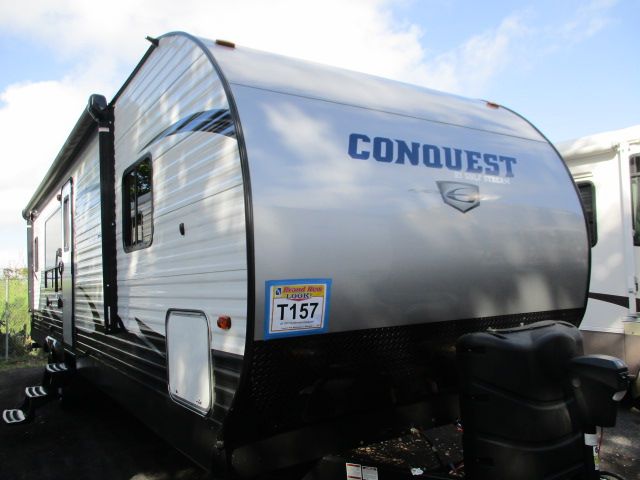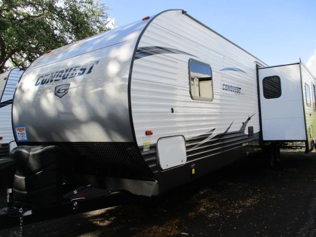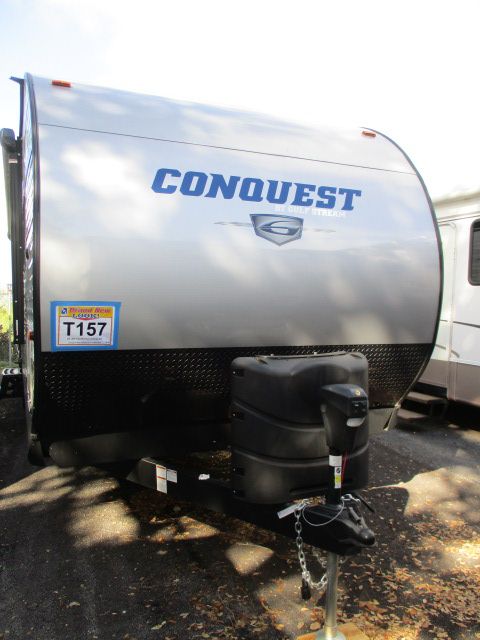 This 2017 Gulfstream Conquest has an Electric Tongue Jack, 1 Slide-out, 1 Ducted Roof A/C, 2door Refrigerator, Main Awning, CD Radio, Outside Speakers, Outside Shower, Microwave, 3 Burner Range, Oven, Tinted Glass, Ample Storage, Electric Awning and Stabilizer. Nice Neutrel Colors, Vynil Wood Pattern Floors, Wired for Second AC unit at the Bedroom. This Rv is NEW and Ready to go With Manufacturers Warranty. Lets GO!