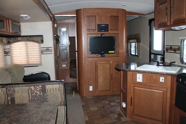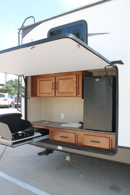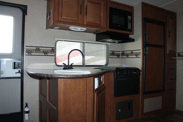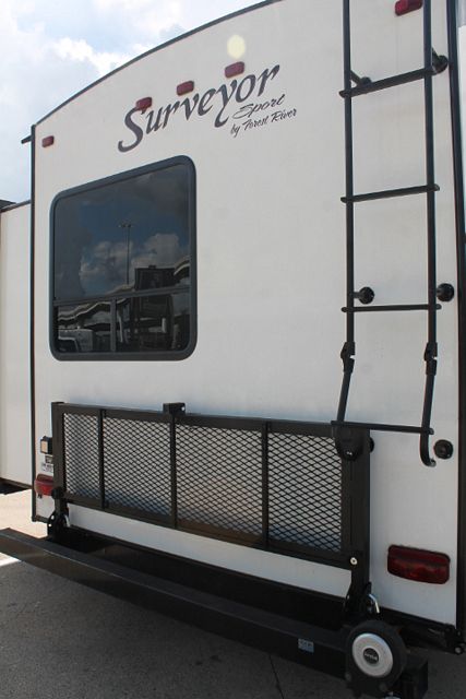 This hardly used 2014 Surveyor Sport by Forest River has this very convenient Electric Tongue Jack for ease in hitching and unhitching, Comforts include....2 Slide-outs, 1 Ducted Roof A/C, Double Door Refrigerator, Main Awning, Outside Shower and Speakers, TV, DVD Player, Microwave, 3 Burner Range and Oven. Also has a Rear Bumper Rack for extra storage and Outdoor Kitchen for great family meals