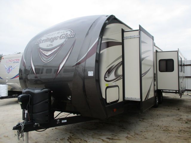 This 2016 Heritage Glen has an Electric Tongue Jack, 3 Slide-outs, 2 Ducted Roof A/Cs, 2 Dr G/E Refrigerator, Electric Main Awning w/LED Awning Light, Fireplace, CD Radio, Outside Speakers, 2 TVs, Microwave, 3 Burner Range w/ Glass top Cover, Oven, Electric Stabilizers, New Upgraded Tires, Extreme Weather Package, Touch Screen Remote for Slides, Jacks, Awning, Lights.. Still Under MFG Warranty.. A Remarkable Package for Your Exciting Traveling Adventures.