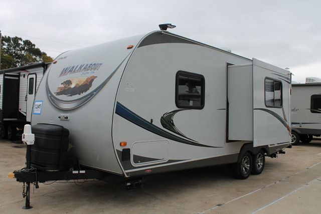 This 2013 Walkabout has a very popular layout with sleeping accommodations for 4. It's Features include....Electric Tongue Jack, 1 Slide-out, 1 Ducted Air Conditioner, Double Door Gas/110V Refrigerator, Automatic Main Awning, CD Radio, Outside Speakers, DVD Player, Outside Shower, Microwave and Oven. Light weight, 1/2 ton towable thats great for last minute trips.