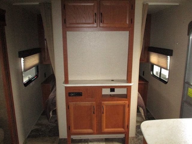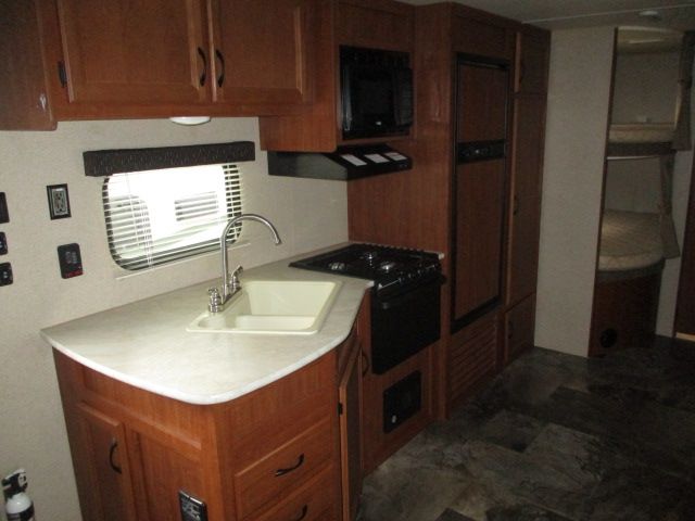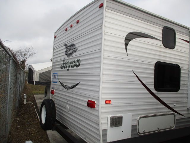 This 2015 Jay Flight Slx has an Electric Tongue Jack, 1 Slide-out, 1 Ducted Air Conditioner, Double Door Gas/110V Norcold Refrigerator, Main Awning, Microwave, 3 Burner Range, Oven