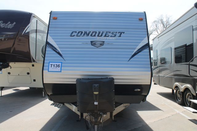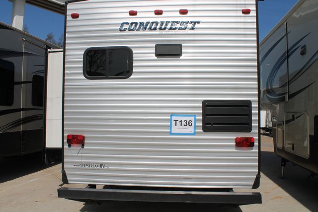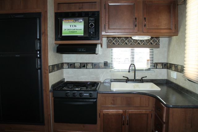 This Nearly New 2015 Gulf Stream Conquest has the popular floor plan with Rear Kitchen. Features include....Electric Tongue Jack, 1 Slide-out, 1 Non-Ducted Air Conditioner, Double Door Gas/110V Refrigerator, Main Awning, CD Radio, Outside Shower, Microwave, 3 Burner Range and Oven. Light Weight, 1/2 Ton Towable thats great for all of your traveling Adventures.