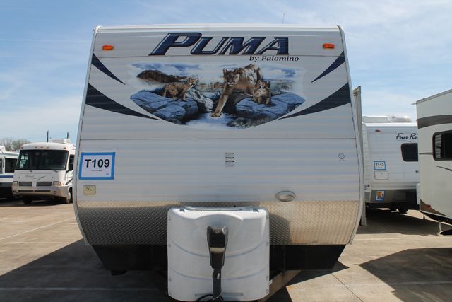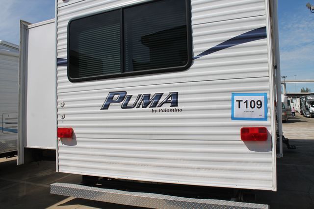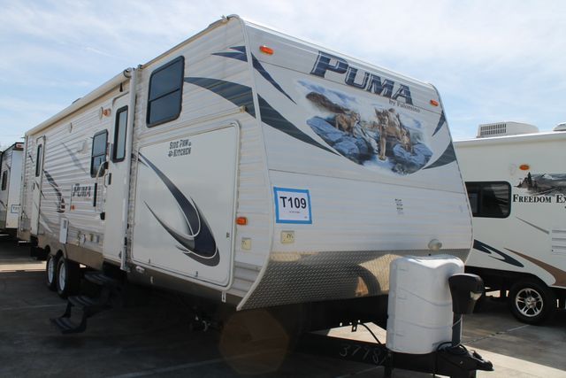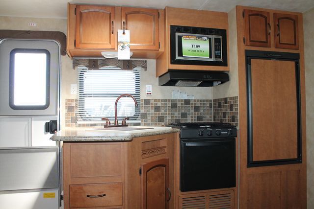 This 2012 Puma has a Family Friendly floor plan that sleeps up to up 9 with an Full Outdoor Kitchen. It's options include....Electric Tongue Jack and Stabilizers, 2 Slide-outs, 1 Ducted Air Conditioner, Single Door Gas/110V Refrigerator, Main Awning, CD Radio, Outside Speakers, TV, DVD Player, Microwave, 3 Burner Range and Oven. Well maintained and it shows. New Microwave, New Stove Vent, New Battery Terminal Connectors, Slide Track Inspected and Lubricated.
